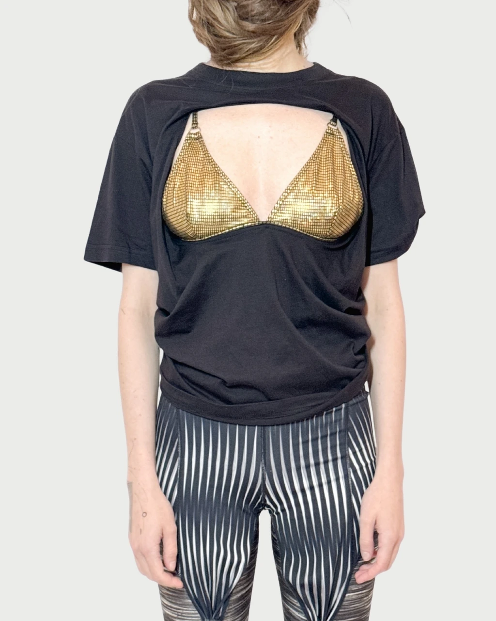a one-of-a-kind deconstructed cotton shirt with bikini top detail