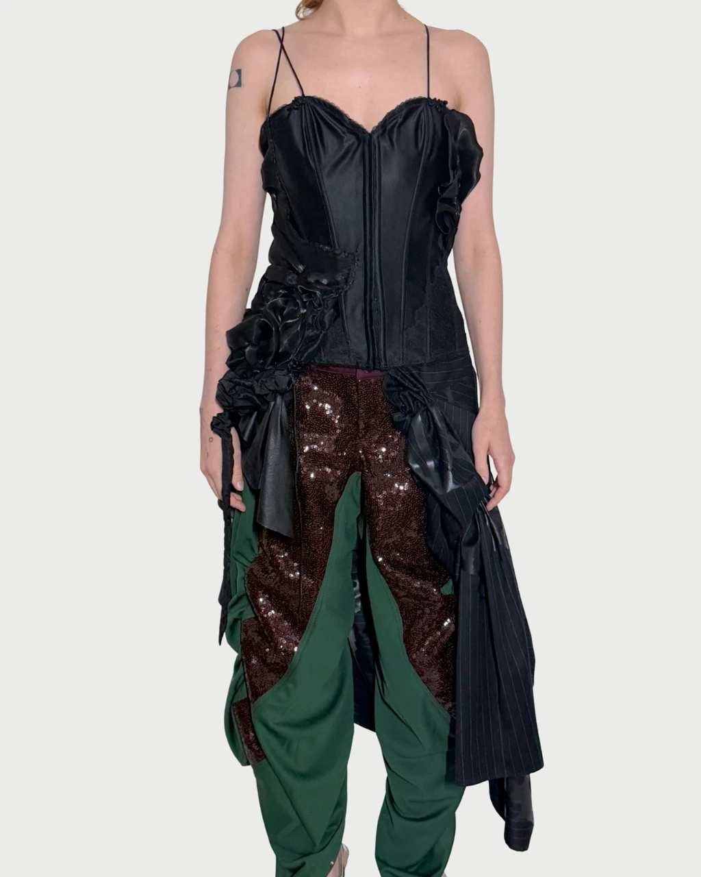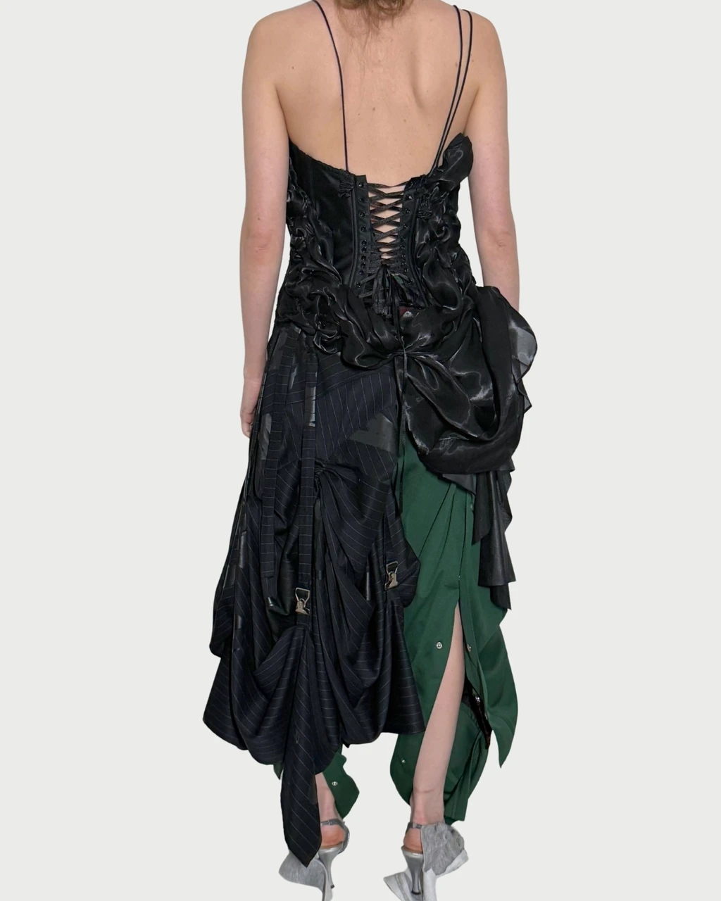 a one-of-a-kind adjustable corset with handsewn draped layers