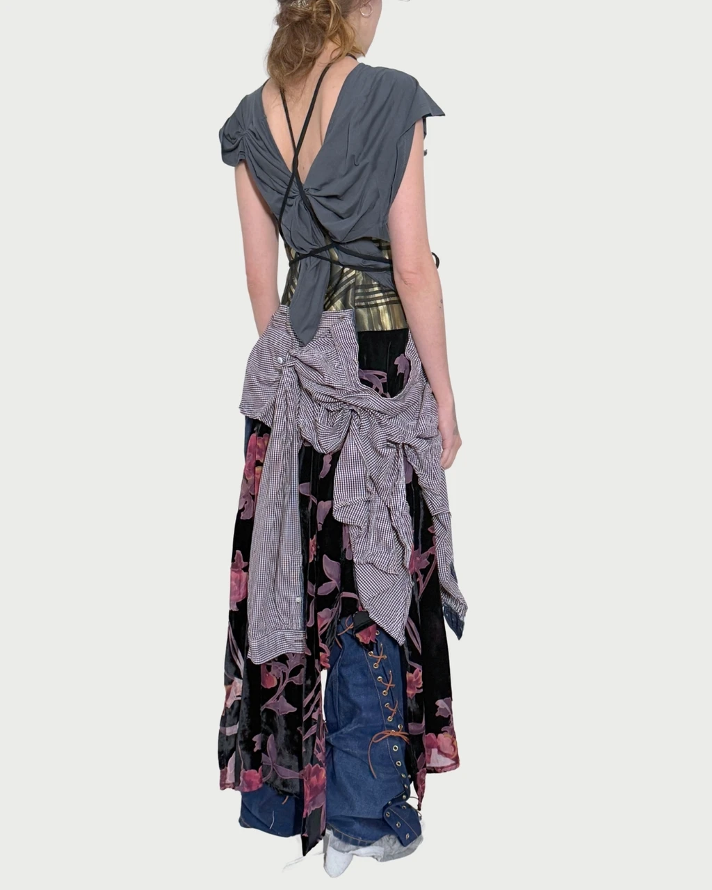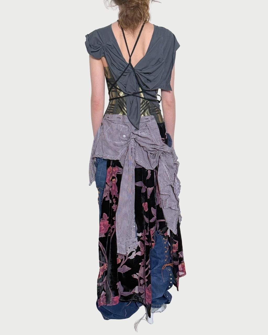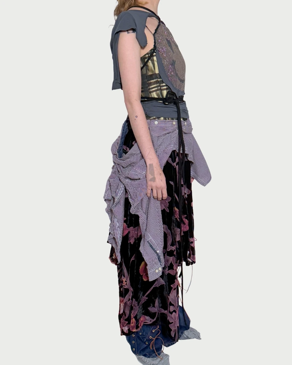 a one-of-a-kind deconstructed layered corset and jersey top with glitter smiley motif