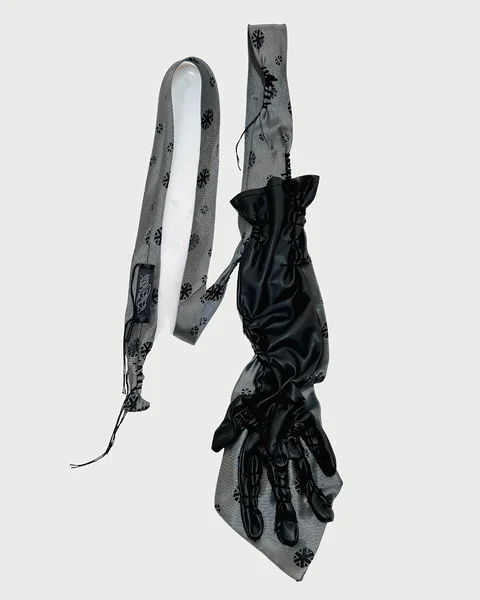 a one-of-a-kind tie accessory with faux leather glove attached