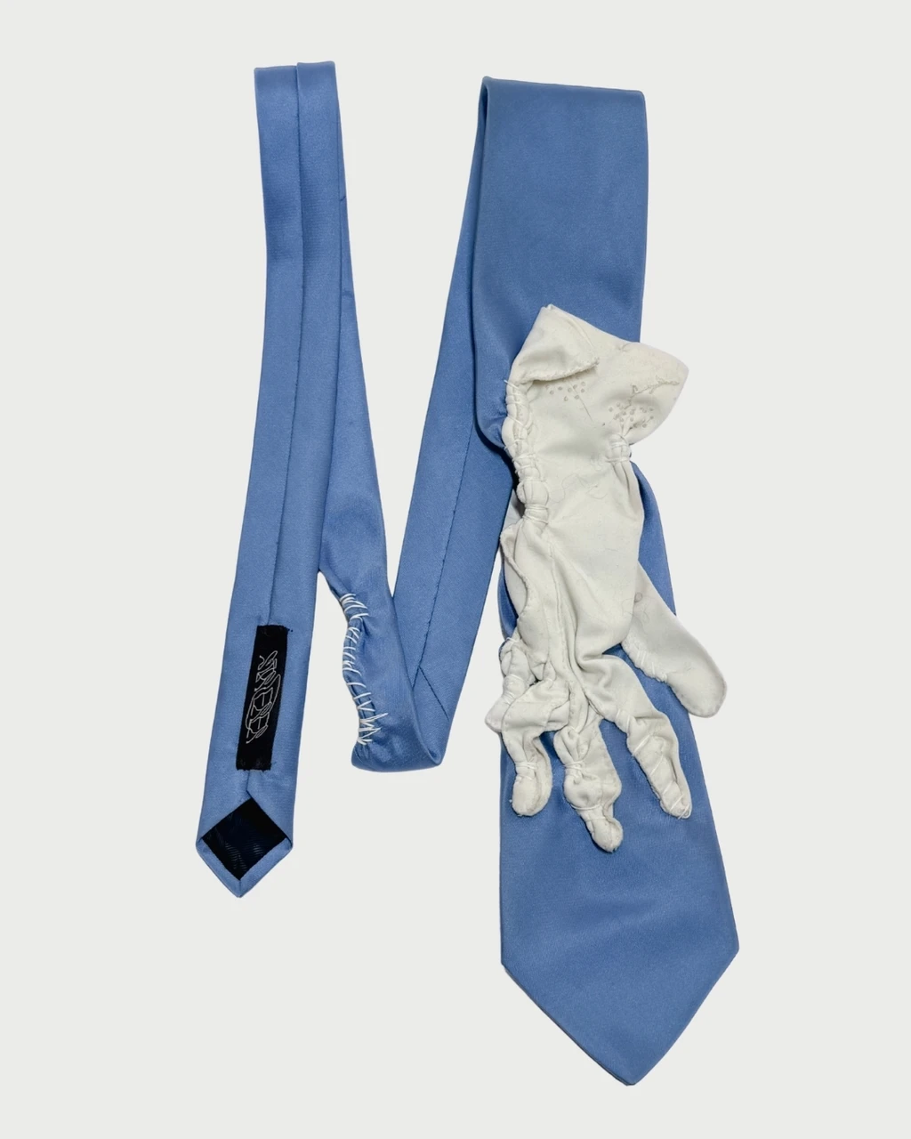 a one-of-a-kind tie accessory with hand stitches and white glove attached