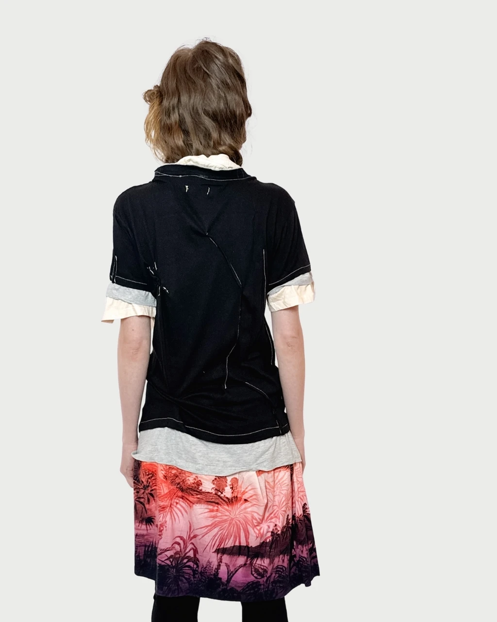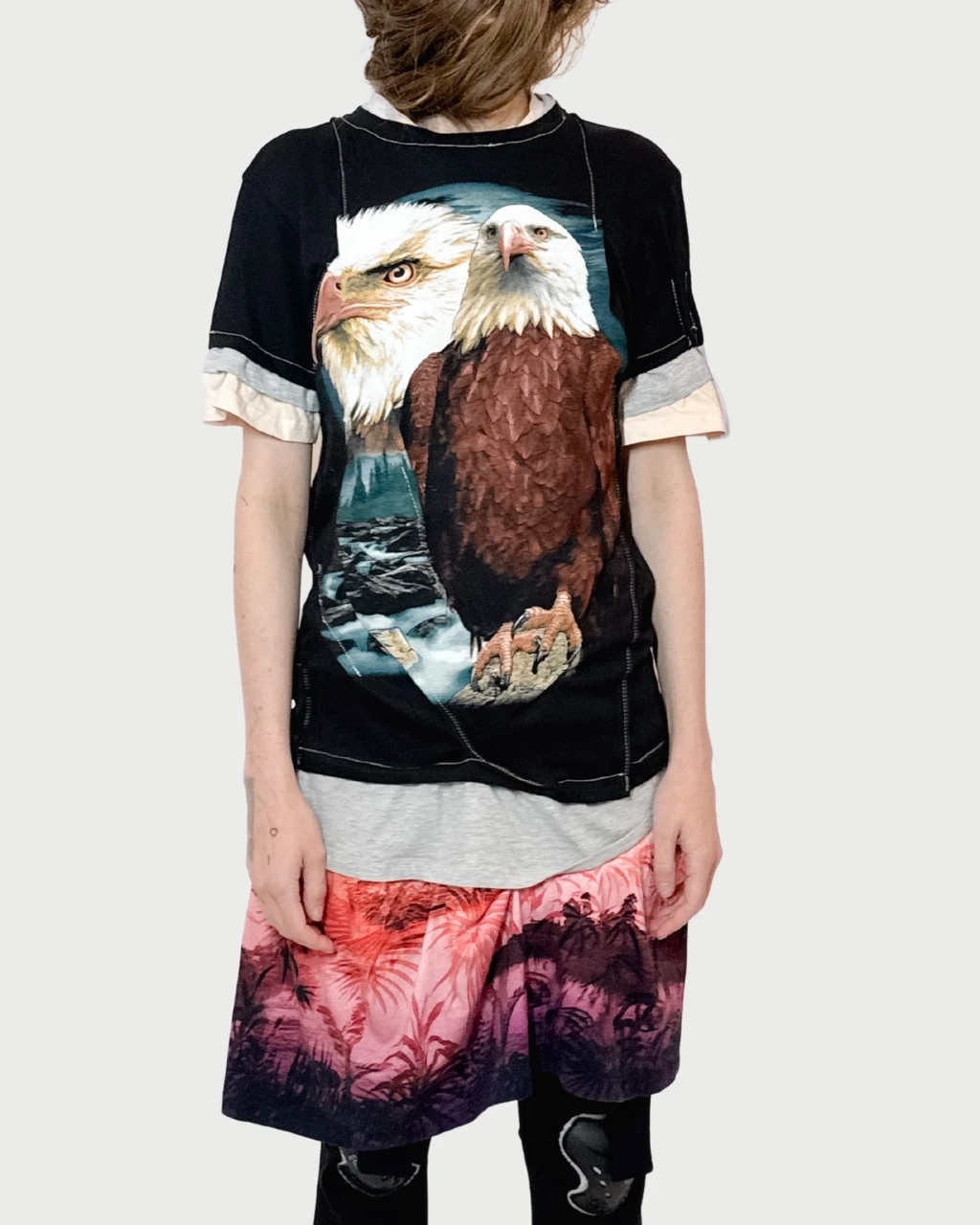 a one-of-a-kind deconstructed layered longer cotton shirt with eagle print