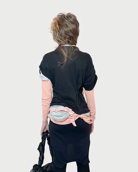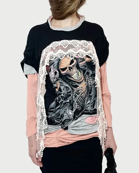 a one-of-a-kind deconstructed layered cotton shirt with lace detail