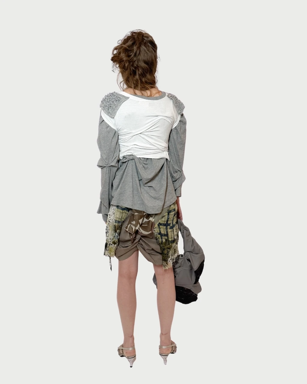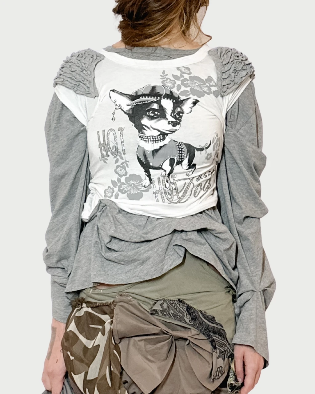 a one-of-a-kind deconstructed layered cotton shirt with puppy print