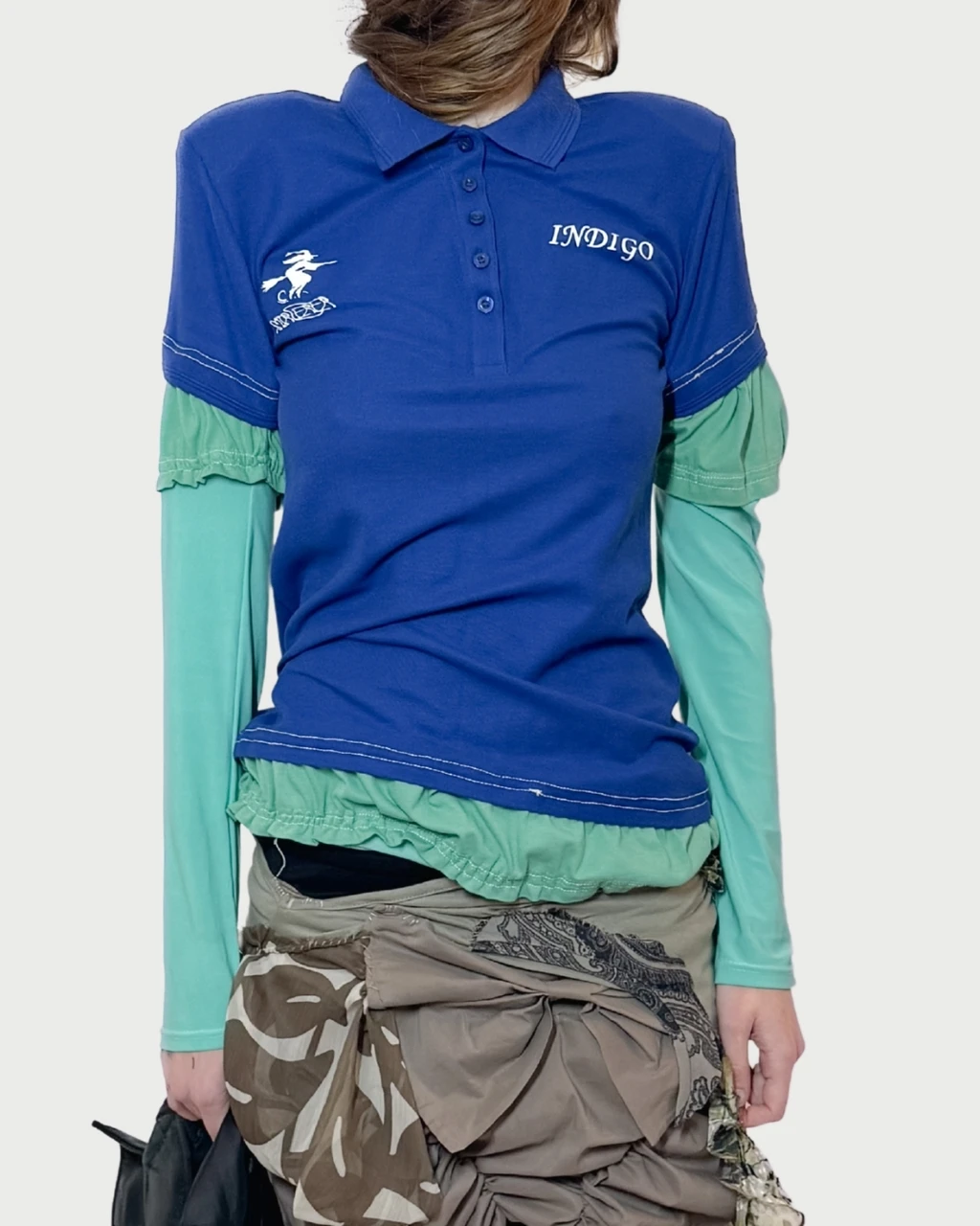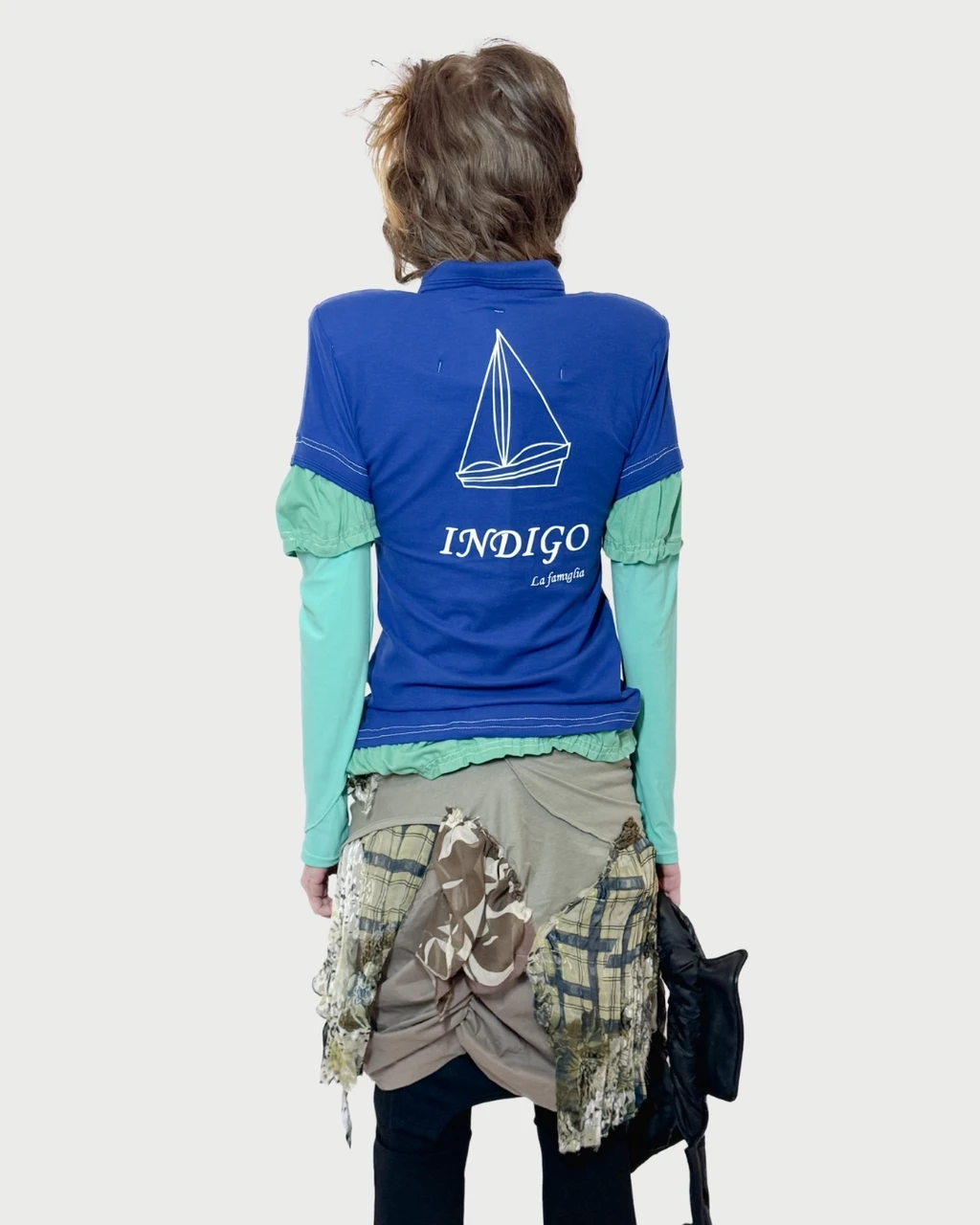 a one-of-a-kind deconstructed layered cotton shirt with shoulder pads