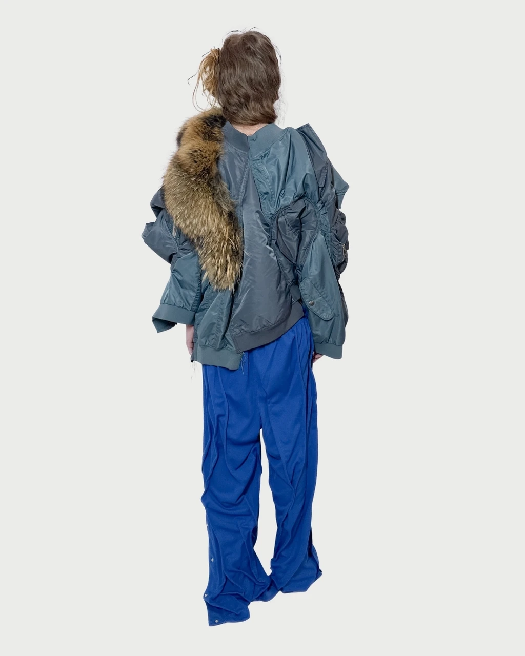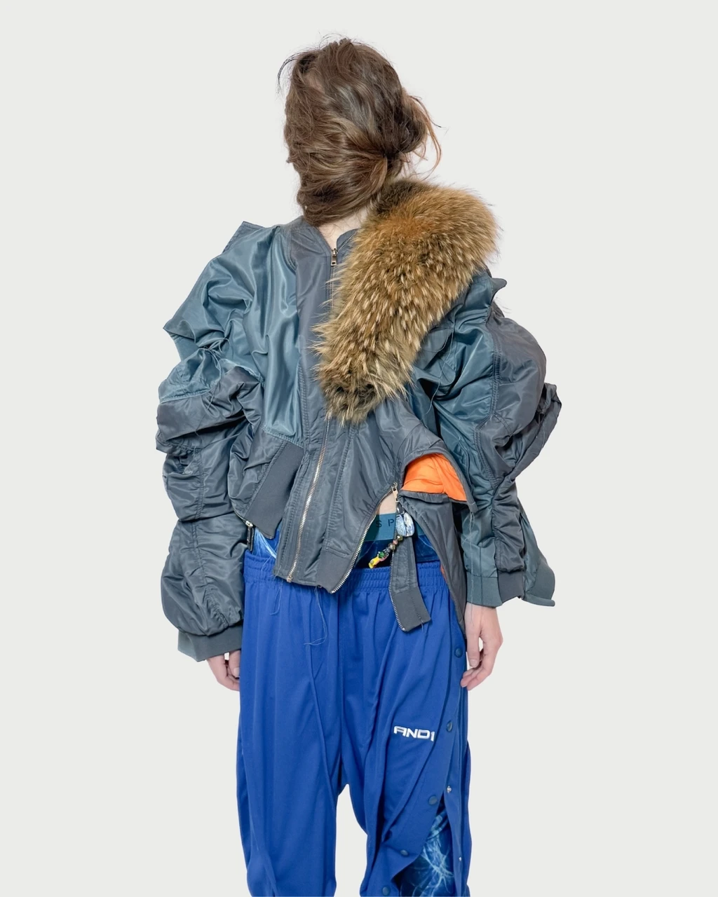 a one-of-a-kind deconstructed oversized bomber jacket with thrifted real fur  collar and trinket