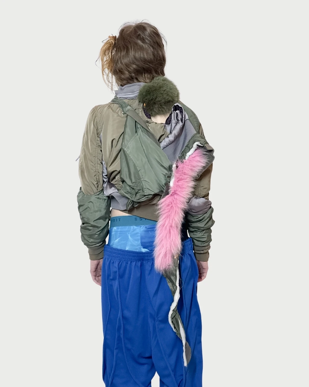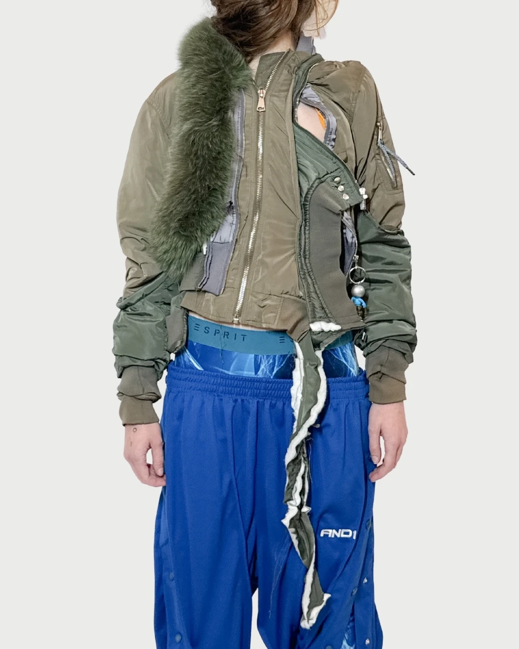 a one-of-a-kind deconstructed bomber jacket with thrifted real fur and trinket
