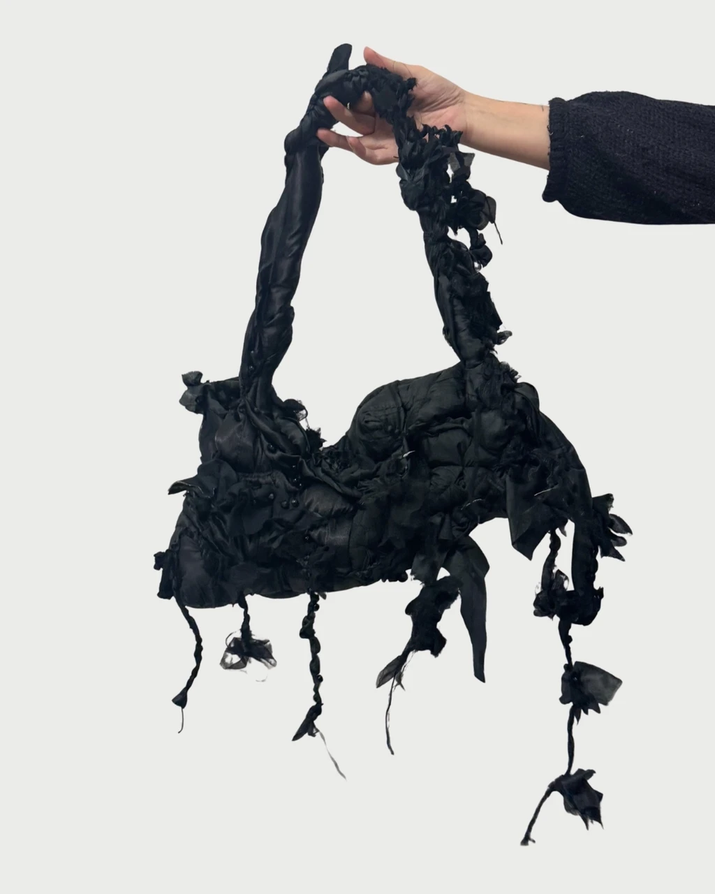 a one-of-a-kind handstitched abstract bag with ribbons and beads