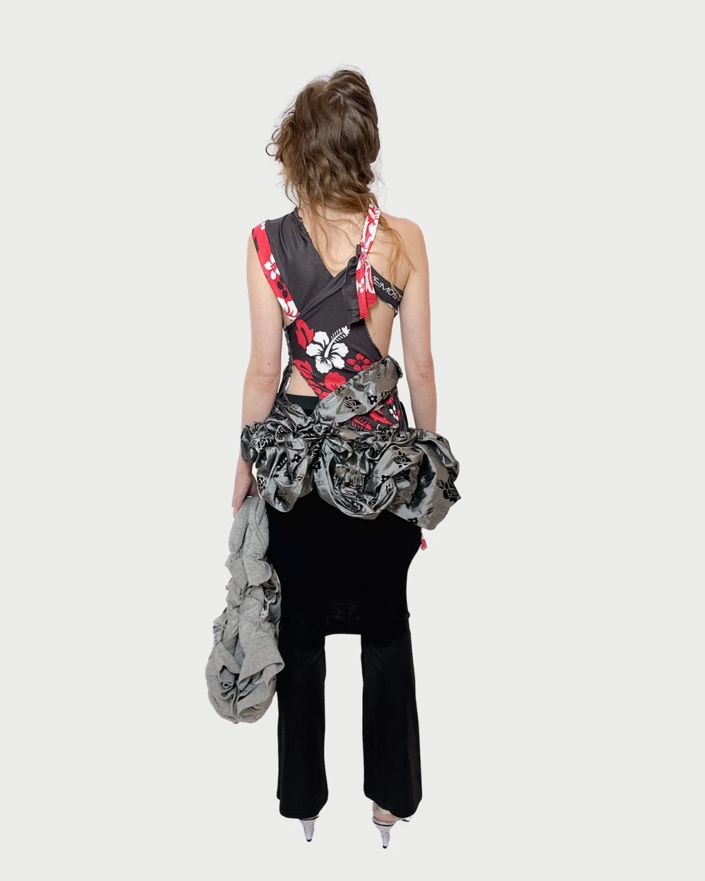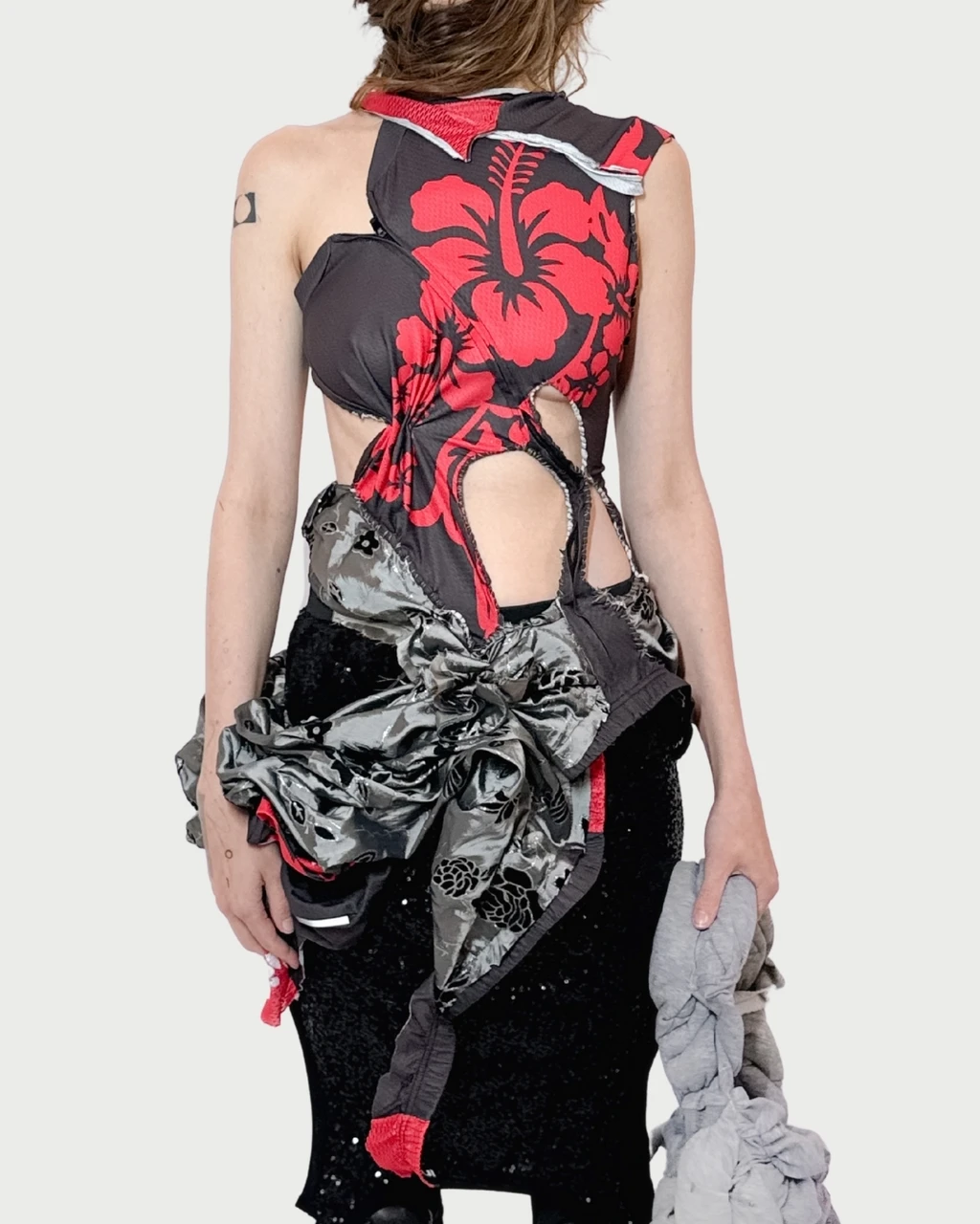 a one-of-a-kind deconstructed top with synthetic flower elements