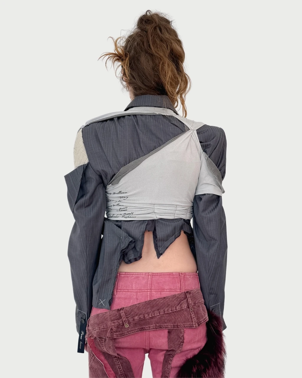 a one-of-a-kind deconstructed blazer with draped jersey layer