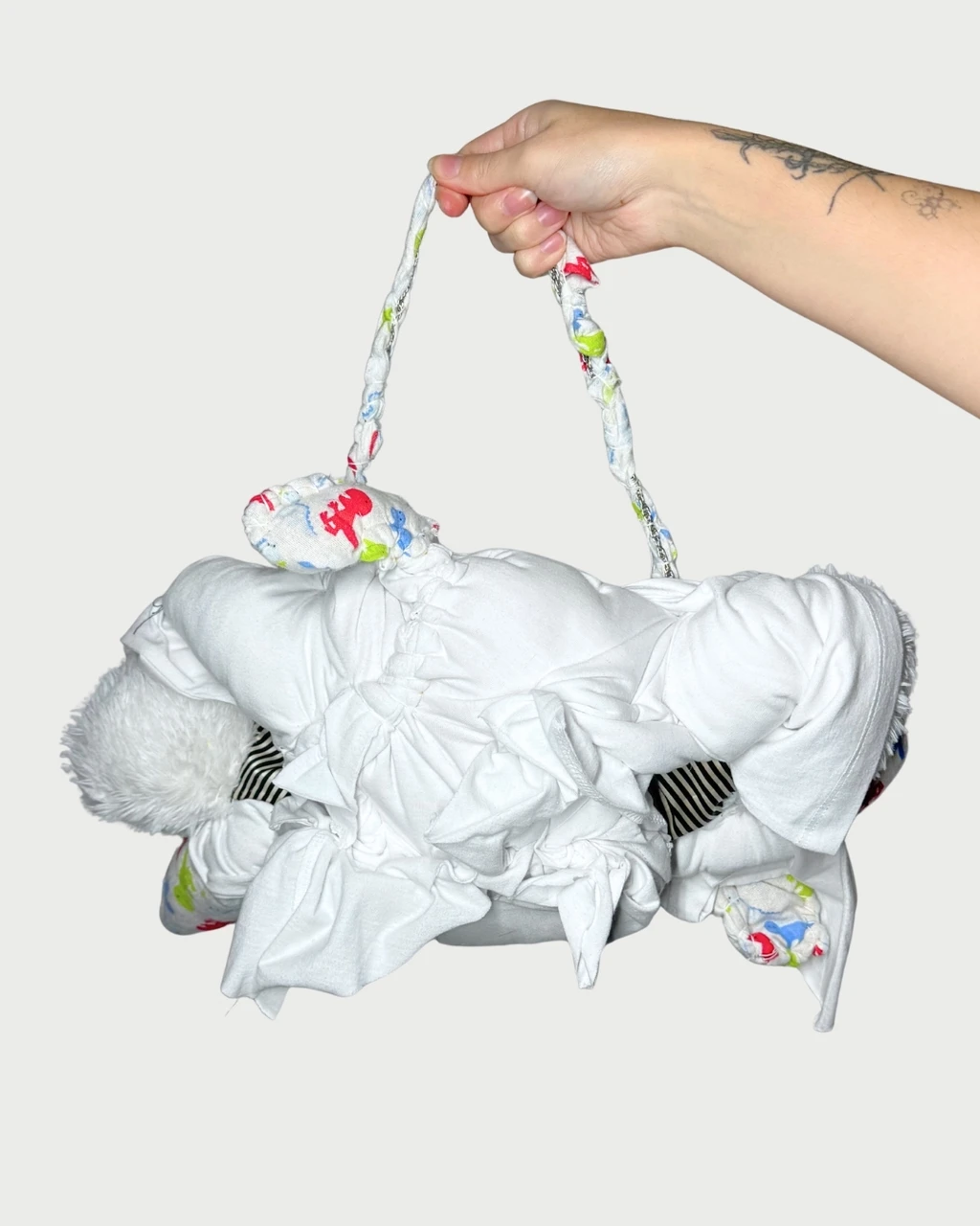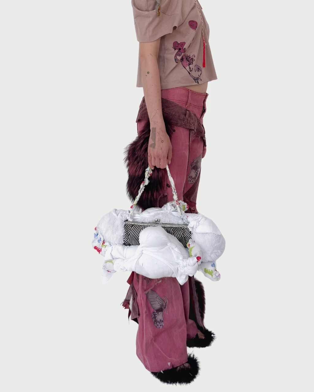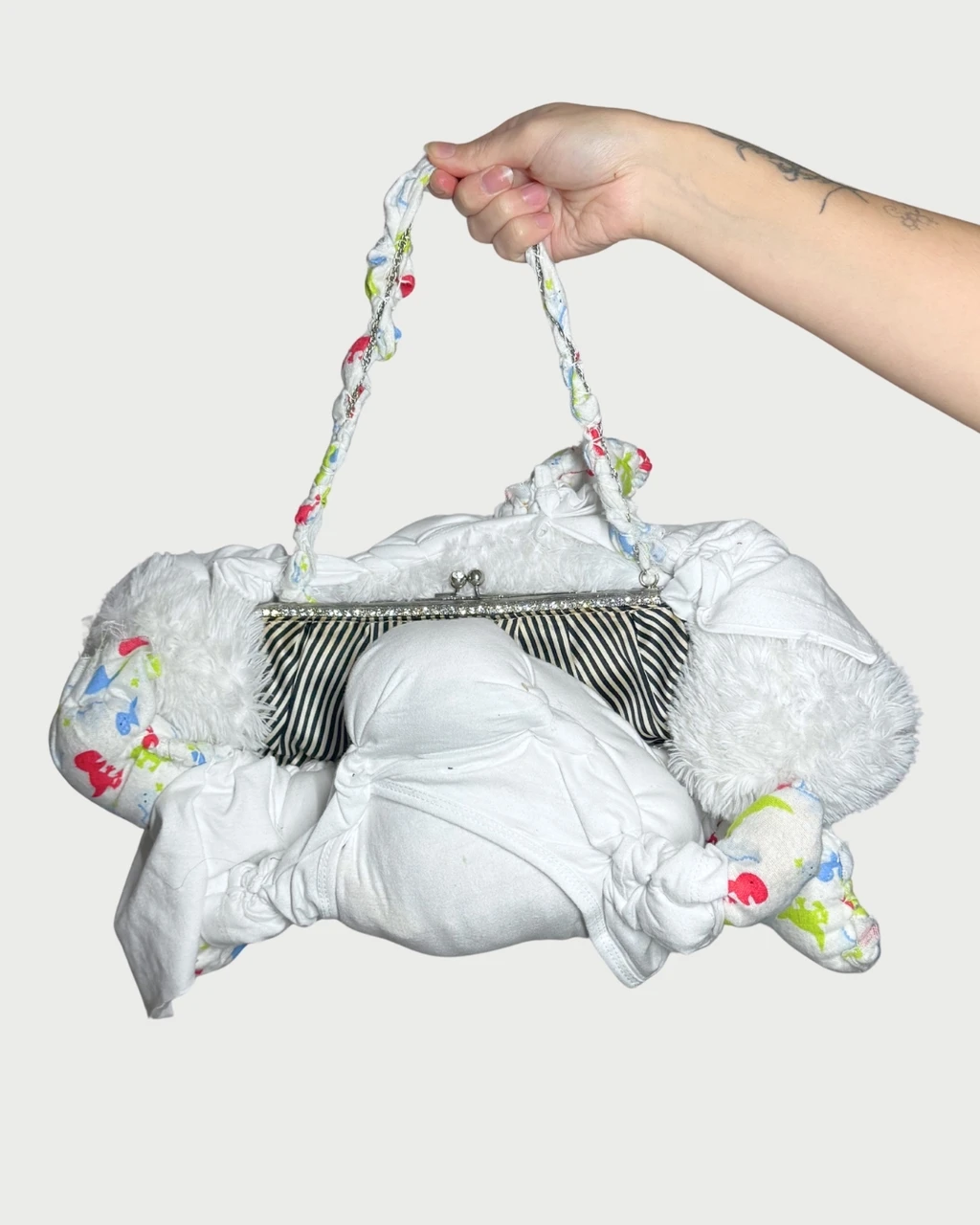 a one-of-a-kind deconstructed handbag wrapped in a teddy bear cover with jersey and a braided handle